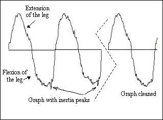It is the exercises performed at 60º/s that call for a more in-depth and thorough analysis, because they supply a huge amount of information. Firstly, the strength curves are preprocessed in order to eliminate inertia peaks, that is, maximum peaks produced by machine inertia rather than by the actual strength of the patient. This is detected when the angle at which the maximum peak is produced deviates a lot from the norm. Figure 2 shows a graph with peaks and the same graph after they have been removed.
