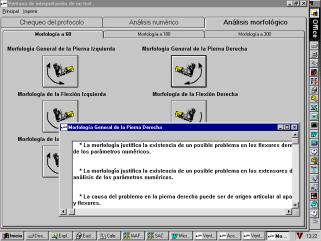Figure 5 shows the interface window for the rule-based subsystem analysis. There are three tags for each part of the analysis described. The morphological analysis has been selected, and there are icons for displaying the conclusions regarding each leg, its flexion and extension. The bottom window shows an overall analysis for the right leg. It points out some problems with the right flexors and extensors and suggests that this could be caused by some dysfunction in the knee joint.