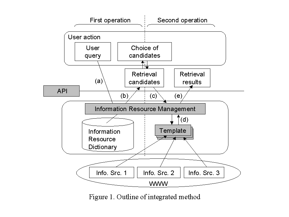An outline of this method is shown in Figure 1. We will explain briefly the integrated consecutive operation. When the user query is issued(fig.1 a), first, various types of heterogeneity such as retrieval interface differences among information sources is resolved using an information resource dictionary (IRD), and retrieval candidates are generated and presented to the user(fig.1 b). The user chooses target sources from these candidates(fig.1 c). Second, information is retrieved from the target sources (fig1. d), and the retrieval results are returned(fig1. e). Retrieval results are a list of item values that satisfy the userfs query. Item values are extracted by using templates. The new API described herein removes the necessity for the user to specify the information sources explicitly. The roles and functions of template, IRD, and API are explained briefly as follows.