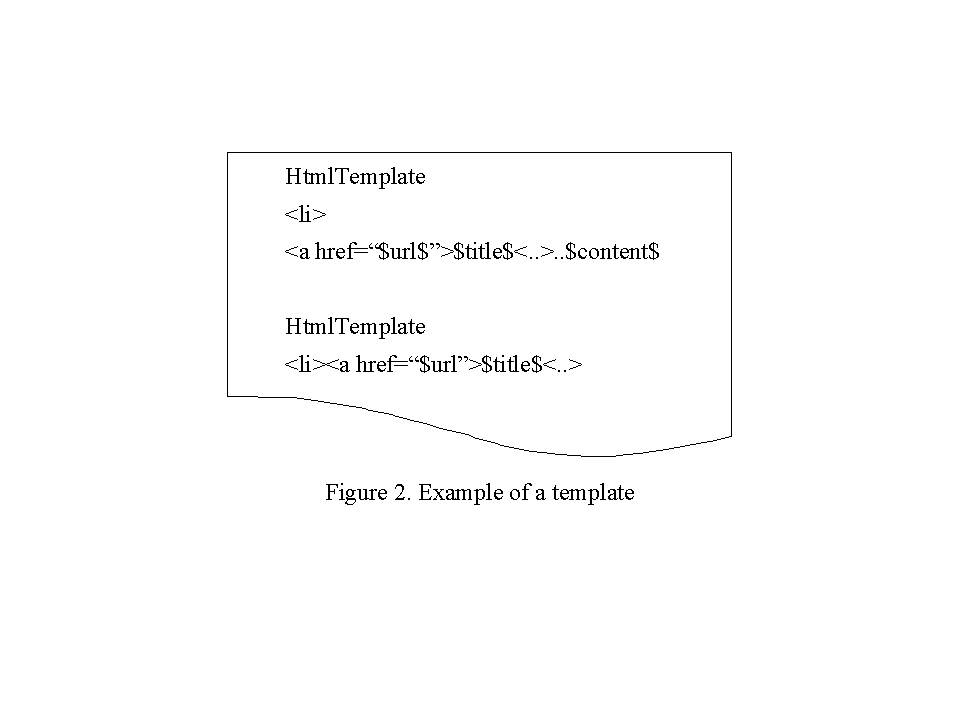 Retrieval can be made more efficient if information can be retrieved from various sources as if they were relational databases. However, there is no common rule on the structure of HTML documents. We adopted a template mechanism through which one could treat HTML documents as if they were RDB tables. An example of a template is depicted in Figure 2. The template describes multiple data extraction patterns. The part subsequent to gHtmlTemplateh corresponds to one extraction pattern. In the extraction pattern, the parts enclosed in $$ correspond to the locations of data value that are extracted. The character string enclosed in $$ becomes the name of the extracted data item. In this template, item names are gurlh, gtitleh, and gcontenth. The character string g..h allows pattern matching with any character string. If a part that matches the pattern is found, starting with the highest-ranking pattern, the parts corresponding to the location of the data items are extracted as the values of the item. There are various approaches for extracting information from WWW sources[1, 5]. Up to now templates have been created manually by system administrators. The semiautomatic generation of templates is possible by detecting repetitions in tag patterns that extend over multiple lines. A template is made by actions such as removing the patterns that are seldom used.