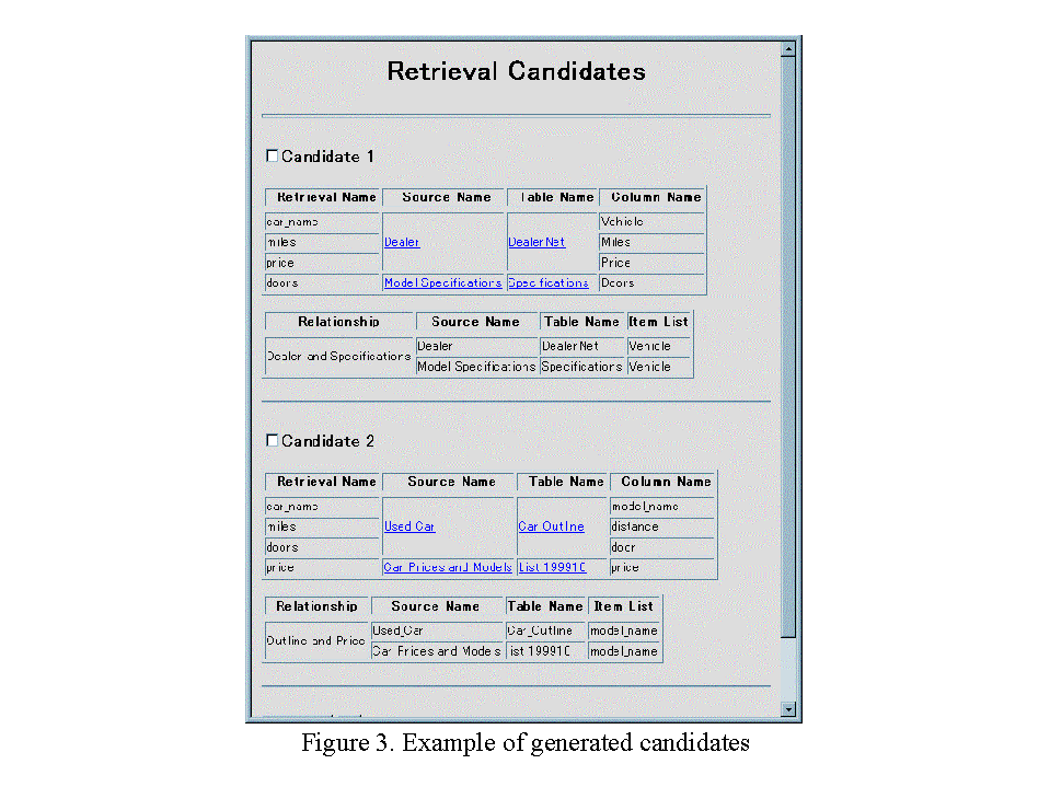 An example of candidate sources for the above query is shown in Figure 3. After the user query is issued, the retrieval names are compared with synonyms of each item name in the term dictionary. The synonyms corresponding to retrieval names are then searched for in the schema dictionary. Column name is compared with synonyms, and sources that include all items are returned as the candidate sources. In figure 3, the column name gVehicleh of candidate 1 matches the synonym of retrieval name gcar_nameh. Candidate sources created from multiple sources are displayed together with their join relationship. Figure 3 shows that two sources are joined by gVehicleh in candidate 1.