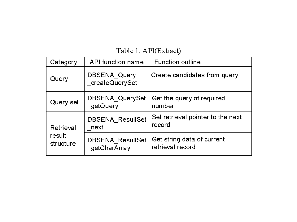 One benefit of this method is that it offers an original API which simplifies the development of application programs. In the WWW, web sources are frequently added and/or changed. Therefore, it is too difficult to construct and maintain application programs that use a language that specifies the location and the structure of the data, such as SQL. The original API is based on a universal relation[6] so there is no need to specify the information sources. Application development is independent of the system design and we can maintain and operate any such application without concern for the number or structure of the web sources. Typical API is shown in Table 1.
