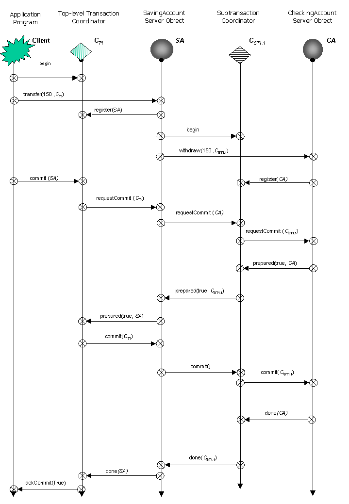 Since the execution of the transfer method performs a call to the withdraw method of the CheckingAccount object associated to the SavingsAccount object SA (CA:=SA.cc), a subtransaction is started by SA. In order to start a new subtransaction, SA instanciates a subtransaction Coordinator CST1.1. Next, SA invokes the begin method of CST1.1 starting a new subtransaction T1.1. Then, SA invokes the withdraw (150.00, CST1.1) method of the object CA.