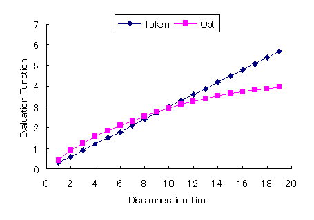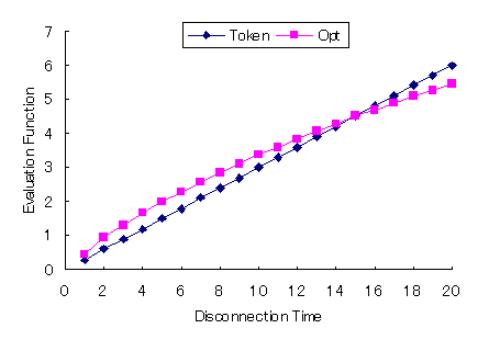 The graphs in Figure 2 and Figure 3 show how the values of the evaluation functions for each method are affected by the change of disconnection time. From the graphs we can see that with different values of K, the algorithm gives a different result of the choice of method as the value of the evaluation function of optimistic method is affected by the change of value K. As a guidance to choose the value of K, for applications which cannot tolerate waiting time and needs to be committed urgently (e.g. those involving money like systems for business trading, budget management and bank account management), it is appropriate to set the value of K bigger. On the other hand, a small value of K fits applications like schedule management systems as they are not time-critical and transactions in these systems are relatively simple and thus rollback can easily be performed.