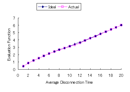 We now investigate the effectiveness of our algorithm when the disconnection time deviates from the expected value. To achieve this purpose, we used a few probability distributions (Poisson, normal, uniform and exponential) to confirm the validity of the results. In these distributions, we calculate the ideal values (i.e., when the exact disconnection time is known beforehand) and the actual values (i.e., when we take the average disconnection time as the parameter) of the proposed algorithm. Figure 4 shows the result for Poisson distribution. From the graph, it can be observed that the difference between the actual values and the ideal values is very small. The difference increases as the disconnection time approaches the point where the values of evaluation functions for token and optimistic methods intersect. From calculation, we found that the percentage of difference for each disconnection time ((ideal- actual) / ideal) is less than 5% for Poisson, normal and uniform distribution, and less than 10% for exponential distribution. Hence, it is verified that even if the proposed algorithm's performance deteriorates due to the deviation of the disconnection time, as long as the deviation is not extreme and follows a common probability distribution, it still outperforms the approach which only uses a single method, either token or optimistic method.