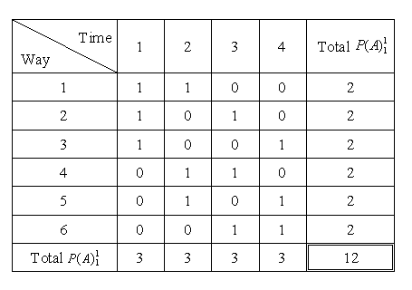 The formula of P(A)it can be expanded into summation of tCi terms, in which each term equals (P(A)11)i(P(A)01)(t-i), and thus contains i number of P(A)11 and (t-i) number of P(A)01. Hence, when we consider the total of all tCi terms, there are i × tCi number of P(A)11. These i × tCi number of P(A)11 are also evenly distributed over the time 1,2,...,t. So, for each time 1,2,...,t, the total number of P(A)11 is (i × tCi)/t. As an example, consider the case of P(A)24 (t = 4 and i = 2) in Figure 1. To arrange 2 transactions in 4 units of time, there are 4C2 ( = 6) ways. The probability that each of these 6 ways happens is P(A)42/6. For each of these 6 ways, there exist 2P(A)11, which add up to the total of (2 ×6)P(A)11, i.e. 12P(A)11. These 12P(A)11 are evenly distributed over the time 1,2,3,4. So, for each time 1,2,3,4, there are (12/4)P(A)11, i.e. 3P(A)11.
