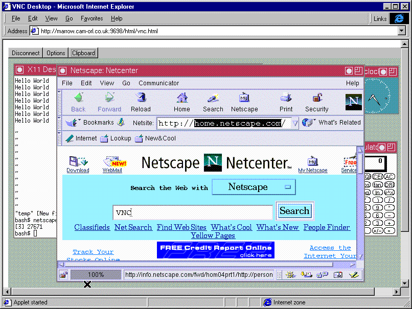 Figure 1. VNC viewer operating netscape, xterm, xcalc, and xclock