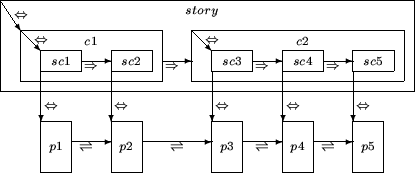 The lesson is composed of one chapter, therefore of one story, composed by two video clips c1 and c2 which must be played one after the other, and by five text documents (pages) p1 through p5 which must be displayed during the clips playback. Clip c1 is composed of two scenes sc1 and sc2, whereas clip c2 contains three scenes, sc3, sc4 and sc5. Each scene must be associated to a different text page.