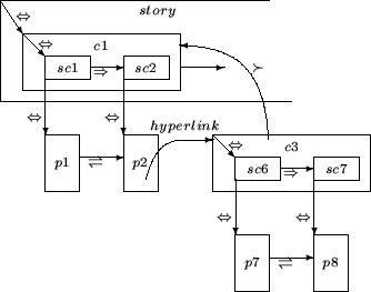 A page must be associated with a scene in order to be displayed. According to the synchronization primitives that we shall discuss later, playing a scene causes the corresponding page to be displayed. Conversely, accessing a page via a hyperlink causes the corresponding scene to be played. Coherently with the class of applications we want to model, a master-slave relationship is established between the dynamic and the static components of a hypermedia document: the dynamic components control the hypermedia document playback, and the static components are synchronized accordingly. We shall come back to this matter later.