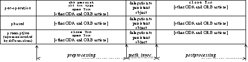 In commercial ODAs as well as by ODAF default assumptions two styles of transaction management are generally available. The first one - called per-operation style - causes transaction to be open/commit before/after each operation invocation. The second one - called phased style - lets CORBA clients to explicitly settle transaction boundaries by invoking special operations defined in target object's interface. The principal difference between the two techniques is that transaction boundaries enclose only one operation invocation of target persistent object in the first case, and a bunch of operation invocations in the second one. From the client's viewpoint, the transaction management is done implicitly in the first case, and explicitly in the second one (i.e. clients explicitly manage transaction borders). It should be noted, however, that the per-operation style is much more adapted to CORBA philosophy since the remote (sometimes untrustworthy) clients cannot handle the server's memory, whereas in phased style an evil client can effectively lock the server by delaying an open transaction's committing. Moreover, even if the clients behave properly, the degree of concurrency is much lower in phased style, which negatively impacts the overall performance of the system.