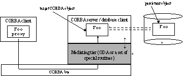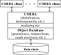 Thus, different approaches adopted on different levels of abstraction can be applied to attain the CORBA/ODB integration. All those approaches have a common component: they imply existence of an additional mediating tier operating between both parties of the integration. The resulting CORBA/ODB system is composed from three tiers, where CORBA operates as a front-end and database operates as a back-end (Figure 1). The CORBA clients are seen by ODB system via CORBA server, which operates as a regular database client.