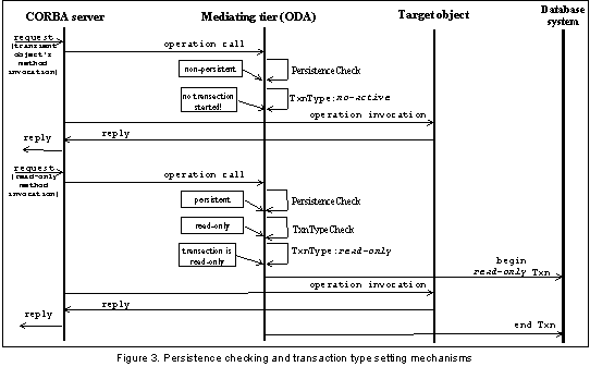 To minimize transactions' involvement, the first idea was to make adapter to automatically decide whether to open a transaction. Such decision was to be based on the distinction between persistent and transient target objects. This approach, however, is misleading since the object being itself transient can deal with another objects which in turn are persistent (e.g. lookUpObject method of transient object, which can be used to locate other persistent objects). In fact, the decision whether a transaction must be started is difficult to make without having an application-specific information. Instead, some simple and effective means should be provided to application programmer (the adapter user) to instruct the adapter whether it should begin transaction for any particular request of method invocation. For that reasons mechanisms for dynamically passing the adapter an appropriate user-defined function have been added to proprietary adapter. Such function takes the incoming request's parameters (e.g. CORBA's Request object) as an argument and returns boolean indicating whether the destination object needs transaction opening. Additionally, a private flag was introduced to adapter, which indicates whether adapter should use that persistence checking function or not. Thus, the persistence check capability can be switched on/off at any moment. It is the responsibility of an application programmer to implement such function. In the simplest case it would be enough to perform string comparison to decide whether the current request needs transaction (e.g. if the request is standard _IT_PING to transient locator object, the function returns 0). The adapter can also provide default persistence-checking function, which simply returns 1, i.e. in accordance with the default behavior of the adapter every incoming request causes transaction opening.