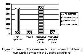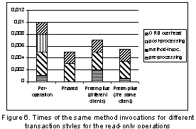 Mainly two types of operations on target object were invoked - read-only and update. The measurements were taken for both transaction styles offered in ODAF - phased and per-operation - as well as newly introduced preemptive style. The preemptive style behaves exactly like phased style as far as the consecutive requests come from the same client.