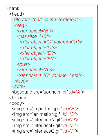 In the proposed language, content providers can describe the transmission order of inline objects in the head section of the HTML document. Each inline object whose time order is specified must be assigned a unique identifier in the HTML document, and is referred to with the identifier in the description of the transmission order. The transmission order is specified by four elements: seq (sequential transmission), par (parallel transmission), xfer (transfer of an inline object) and dto (description of transmission order). Below we describe the syntax and semantics of these elements along with their usage through examples.