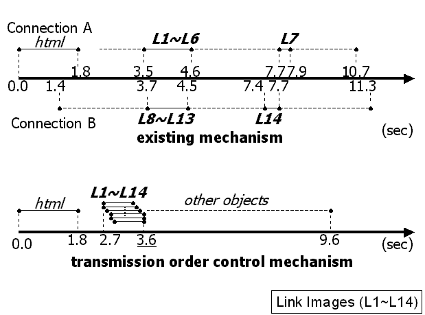 Figure 10 shows the measurement result when the client accesses the Internet using 56kbps modem. Note that Internet Explorer uses two TCP connections to get inline objects with HTTP/1.1 and it does not support pipelining. This result shows that our proposed mechanism can complete the transmission of the link images 4.3 seconds earlier than the existing transmission mechanism. Of course, the amount of the latency reduction may change every time we try to download the page depending on several factors such as the degree of network congestion and the server load. Our proposed mechanism, however, can guarantee that inline objects are transmitted in the same order in any situation, while the existing mechanism can not.