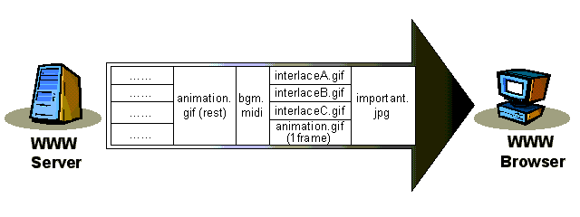 Figure 1 presents an example of the transmission order description in an HTML document. We show how the inline objects are transmitted based on the description. This WWW page contains one important image, and one picture consisting of three interlaced images and one animated image. Moreover, a background sound and many other images are embedded. Based on the description, the important image is transferred first. Next, four partial images are transferred in parallel so that it gives the users a quick preview of the full picture. Following that, the background sound, the rest of the frames of the animated image and other images whose transmission order is not specified are transferred. This transmission based on the description is illustrated in Figure 2.