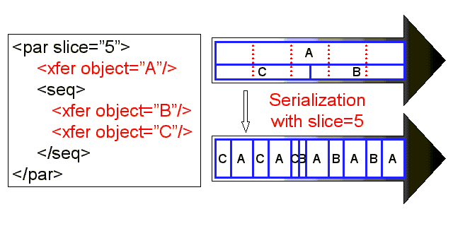 A par element indicates parallel transmission of inline objects. The description is almost the same as the seq element. However, this element must have the slice attribute, which is explained in section 3.1. The following example indicates that three objects with identifiers A, B and C are to be transferred in parallel.
