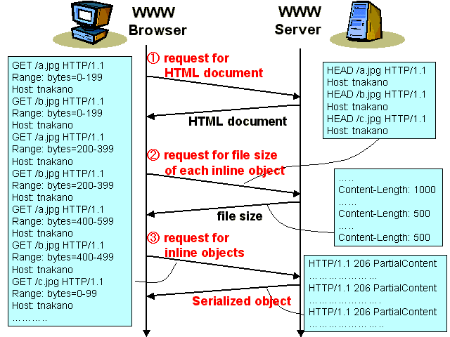In order to realize the serialized transmission of inline objects, we can employ range requests (also known as partial GET) of HTTP/1.1. In the case that we employ range requests of HTTP/1.1, there is no need to change the server and only the web browsers need to be extended to understand the specification of the transmission order and issue range requests to the server. The interaction between the web browser and the server is depicted in Figure 4. First, the browser sends a request for an HTML document to the server as usual and receives the response. Then it parses the received document to extract the specification of the transmission order of inline objects. Since the file size of each inline object is required to issue range requests, the browser then sends pipelined requests for getting the file size of each inline object using the HEAD method. After receiving the file size of every inline object, the browser performs the transmission serialization and issues a number of range requests using pipelining to get the inline objects.