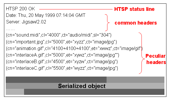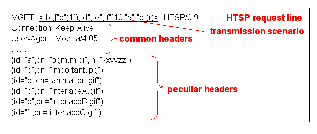 Figure 5 shows the HTSP request message corresponding to the transmission order description in Figure 1, and an example of the corresponding response message is shown in Figure 6. In both messages, there are two kinds of headers. One is the common headers which describe the object-independent information such as Connection, User-Agent, Date, and Server. The other is the peculiar headers. Each line of the peculiar headers describes meta information on one object such as id, cn (Content-Name), in (If-None-Match), cl (Content-Length), ct (Content-Type), and sl (Status-Line). These peculiar headers have the same semantics as the headers in HTTP/1.1. However, we employ compact representation in order to reduce the overhead caused by these header fields.