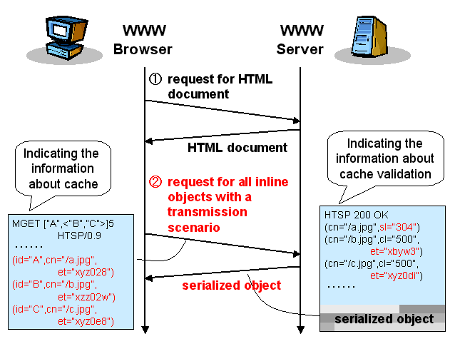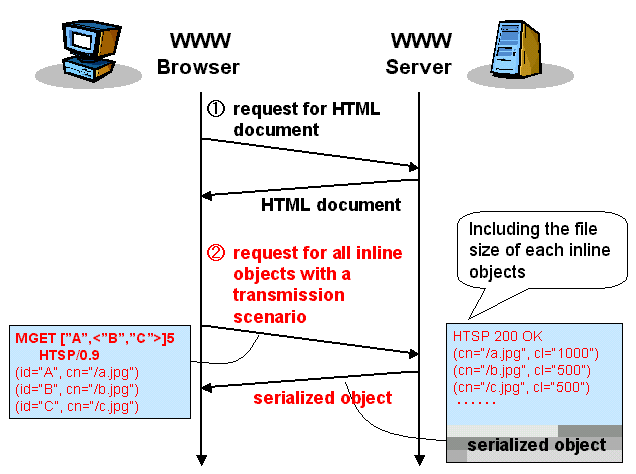 Figure 7 illustrates the interaction between the web browser and the server when we use HTSP. The differences appear in the phase of requesting inline objects. First, there is no need to get the file size of each inline object. Instead, the browser converts the transmission order description extracted from the HTML document into a transmission scenario, and sends an MGET request message along with it. The server then performs the transmission serialization based on the transmission scenario, and sends the serialized body with headers including the file size of each inline object in the scenario. When the browser receives this response message, it learns the file size of each inline object from the headers and performs the transmission serialization in order to recognize how the response body has been serialized.