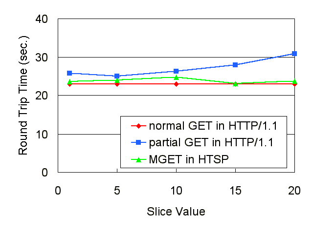 In order to make a comparison of the performance of the proposed protocols, we implemented an HTSP server by extending the W3C Jigsaw 2.02 web server [7] and also implemented a simple client which supports the transmission order control. In the experiments, we used a web page which contains seven inline images with the total data size of 125 KB. The transmission order has been specified so that the seven images are transmitted in parallel. We varied the slice value from 1 to 20 while we measured the round-trip time (RTT) for each of the following three methods: normal GET in HTTP/1.1 without the transmission order control, partial GET in HTTP/1.1, and MGET in HTSP.