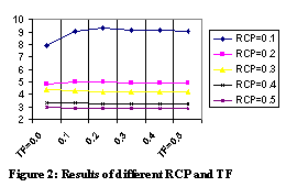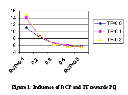 The modeling of time and document aging by using the time factor TF resulted in an improved performance of the prediction qualities. Figure 1 shows a strongly increasing PQ with an increasing time factor for low values of RCP. For high values of RCP the influence of TF disappears. The figure is based on a fixed random value of R=0.2.