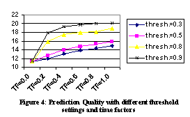 Nevertheless, it should be mentioned that the absolute number of predictions is much lower with high values of TF. This can be explained by improved prediction accuracy: even though there are less prediction tries, the resulting quality is much better. This means that the time factor is able to control the prediction strategy. On the one hand, similar to the threshold, a high setting of TF leads to a pessimistic algorithm with only a few but very good predictions. On the other hand, a low value of TF or of the threshold allows much more prediction proposals which are then of a low quality. We will come back to this problem in 3.2.4.